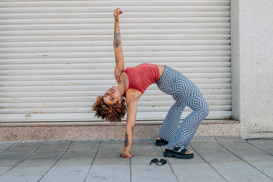 Fit sporty girl doing backbend exercise. Full length. Woman gymnastic silhouette. Urban style, full length, Woman practicing gymnastic yoga in silhouette on sky background.