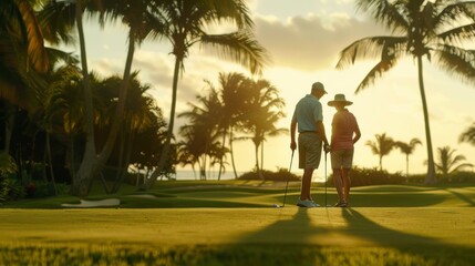 A couple practices their golfing skills together as the sun sets over a lush tropical landscape
