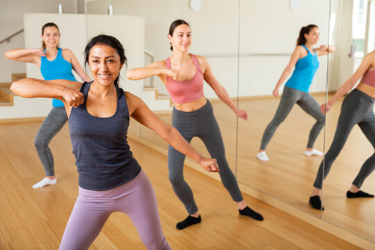 Young man and woman happily practicing swing dance with diverse group of dancers in modern class setting featuring a background with copy space image