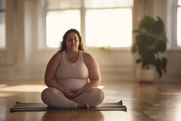 An overweight girl in light-colored clothing practices adaptive yoga in a secluded, bright, modern studio where the emphasis is on individual modification of poses. The scene represents the practition