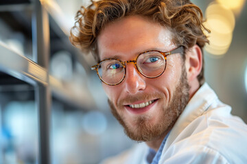 Smiling male scientist in laboratory with glasses. Generative AI image