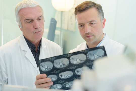 Medical practition examining radiography of patient with back problem in hospital office. Radiologist in medical uniform holding and looking at x-ray, examination, bone, practitoner, analyze