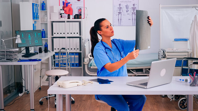 Radiologist holding radiography examining patient disease with back problem typing treatment in laptop sitting in hospital clinic. Medical practition looking at x-ray, analysing bone, diagnosis.