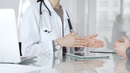 Female doctor consulting patient, explaining treatment options, discussing healthcare in clinic, providing medical advice. Medicine and health care