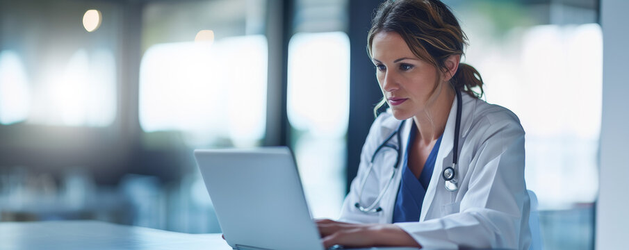 Composed healthcare professional analyzing medical records on her laptop in a clinic setting, Female Doctor