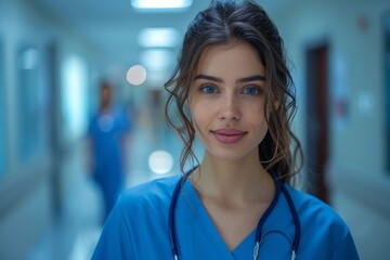 Portrait of a young female nurse in blue scrubs with a stethoscope in a hospital corridor, representing healthcare professionalism