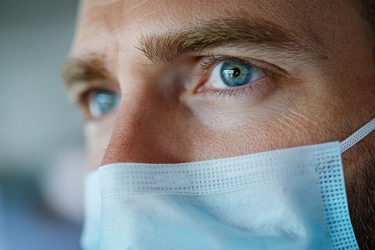 A close-up shot of a man wearing a mask, showcasing intense focus and emotion, reflecting the human experience during medical situations and the importance of health.