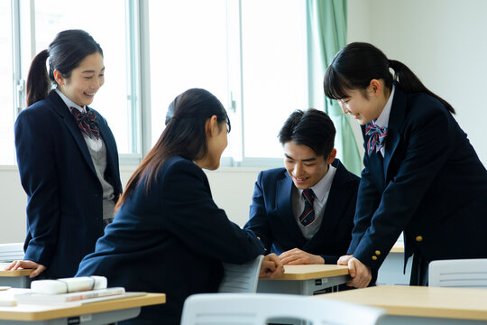 会議の後はリラックス:資料を片付けながら談笑している日本人女性社員
