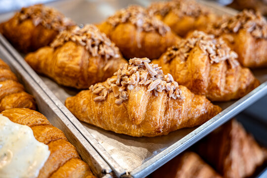 Delicious  Sweet almond croissants on metal prate. Fresh made bakery