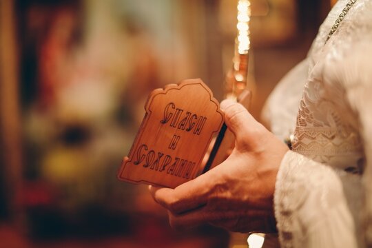 Closeup of a Detailed Tibetan Prayer Wheel with Gold and Bronze Carvings and Buddhist Symbols, Nepal.