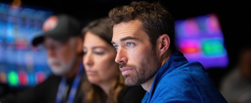 Analysts examining game stats prior to live broadcast commentary session.
