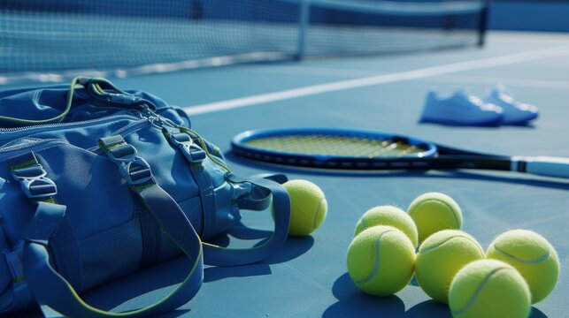 Close up of tennis gear on a hard court, racquet and balls, pre game preparation