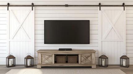 A rustic living room with a white screen TV on a wooden console, surrounded by greenery and cozy furniture.