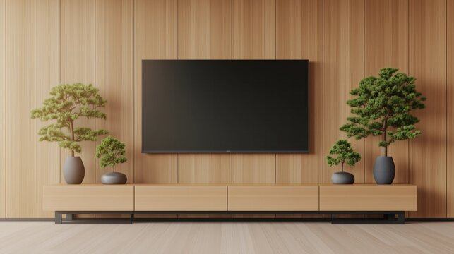 A minimalist living room with a flat-screen TV on a wooden wall, complemented by simple, modern furnishings.