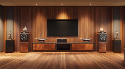 A grand living room with a large flat-screen TV, featuring rich wood tones and sophisticated furnishings.