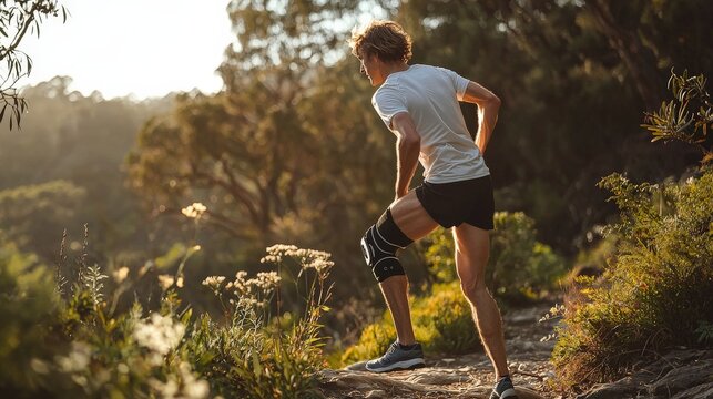 A runner stretching before a morning jog, with the sunrise casting a warm glow, highlighting.