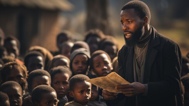 African pastor or priest preaching in village outside to group of poor looking children.