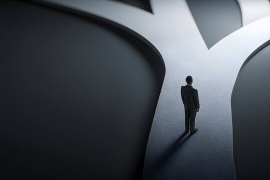 A solitary figure in a suit stands at a crossroads facing a significant decision with two diverging paths ahead, symbolizing choices and uncertainty in life or business.