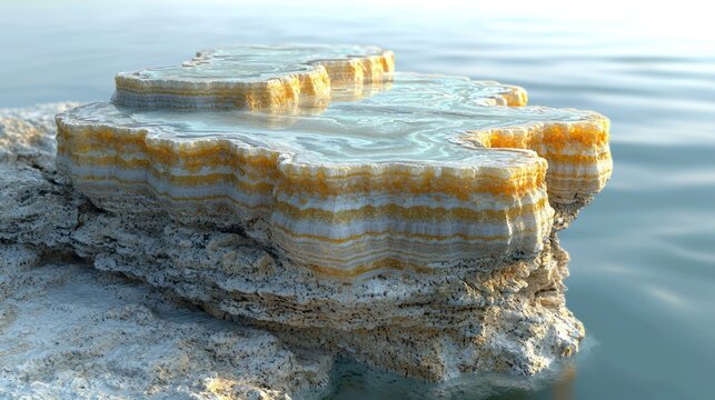 Salt formation emerges from calm water at sunrise, spa background