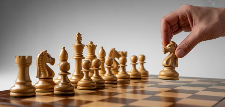 Strategy Unveiled: A hand makes a precise move on a chessboard, signifying strategic planning, critical thinking, and calculated decision-making.