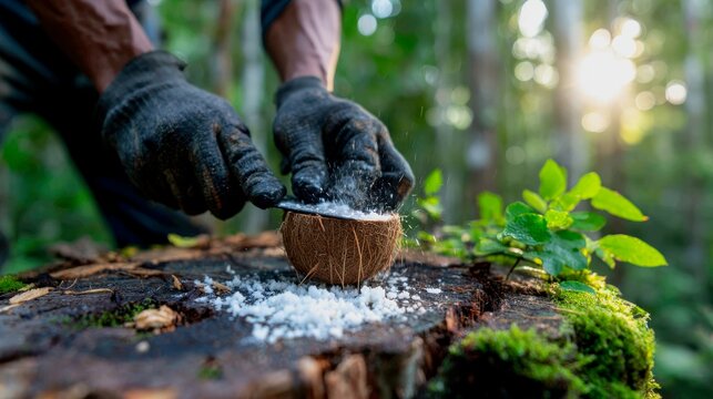 A worker on a rubber plantation in southern Thailand, making a precise cut in the bark of a rubber tree