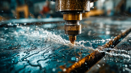 Close-up of laser cutting machine cutting piece of metal with bright blue light