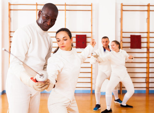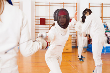 Athletic group practicing effective fencing techniques in sparring in training room