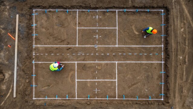An overhead shot focusing on the ground where workers are marking out lines for foundations with chalk marks contrasting against the soil emphasizing precise planning.