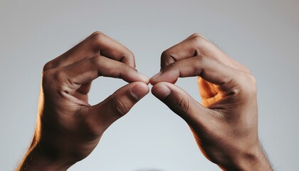 Two male hands demonstrating a precise pinching gesture with accurate finger positioning, macro skin detail, and clean studio lighting on a minimal background, ideal for precision and control concepts