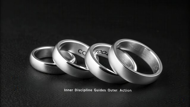 Four polished silver rings of graduating sizes, precisely aligned on a dark textured surface