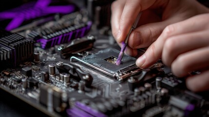 Closeup of hands precisely applying advanced thermal paste on a CPU enhancing cooling performance during intense gaming sessions in a modern desktop setup