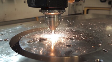 Cnc machine slicing metal with sparks in industrial workshop