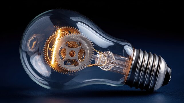 Close up of light bulb with gear mechanism inside isolated on dark blue background. , no logos, no brands