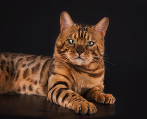 Golden Bengal cat on a black background isolated