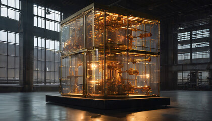Holographic 3d industrial plant hud with tanks, conveyors and modular layout
