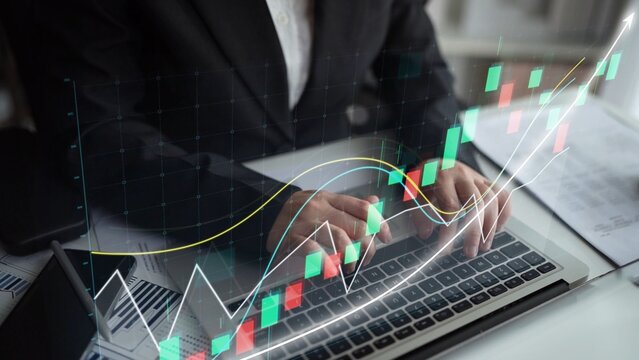 A business professional interacts with cutting-edge technology to visualize data through charts and graphs, symbolizing growth and success in finance. Scalp