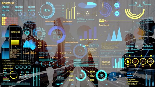 Futuristic digital display with financial data and icons