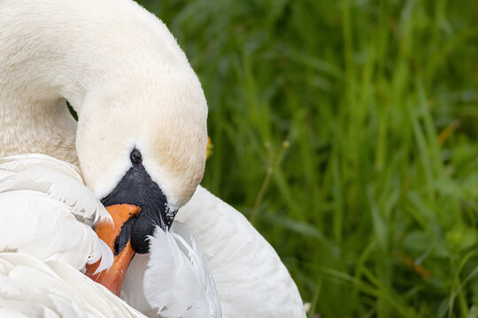 Mute swan preening its plumage, close up, in a spring meadow, Cygnus olor