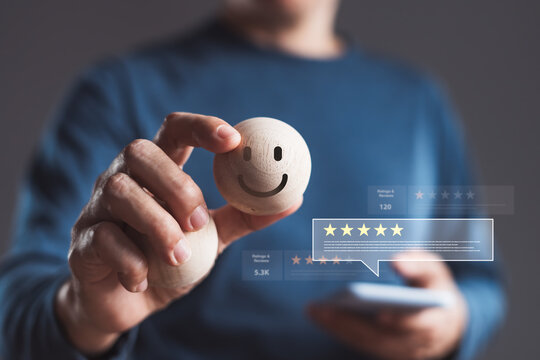 Smiley face and five-star review feedback concept showing customer satisfaction, positive experience, and high-quality service with mobile interaction