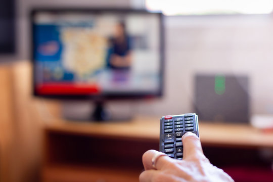 Closeup on tv remote control with hand of woman holding it. Changing television channels in living room. Schedule, choice variety concepts