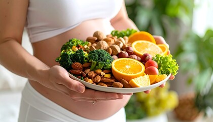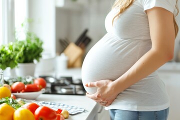Close up of pregnant young woman taking prenatal vitamins and supplements in morning, minimal