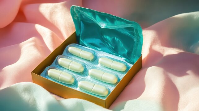 Vitamin d supplement jar with yellow capsules and beige tablets on blue background
