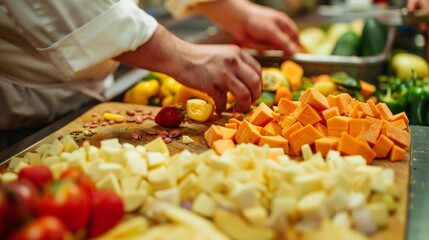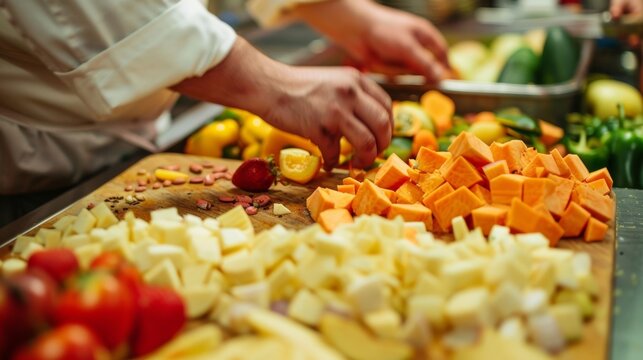 Detailed view of a food preparation area with fresh fruits and vegetables being sorted and chopped for the resident nonreleasable animals.