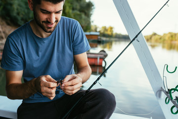Fisherman preparing bait on fishing rod on lakeside in the morning
