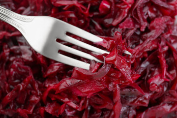Fork with tasty red cabbage sauerkraut as background, closeup