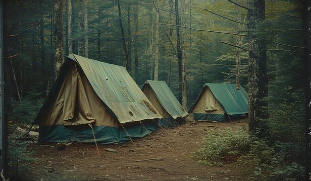 Three vintage canvas tents set up in a lush green forest exude a sense of adventure and nostalgia for classic camping experiences