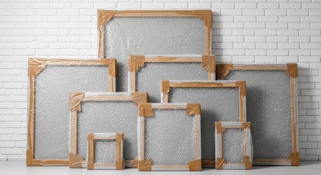 Assorted framed items are prepared for safe transport against a white brick wall.
