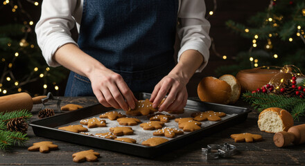 Handcrafted gingerbread cookies on rustic table with holiday decor
