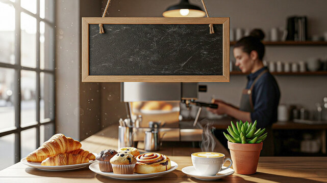 A charming cafe scene with a barista preparing a coffee drink, pastries in front of empty board