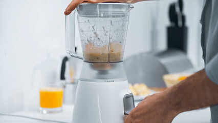Man preparing fresh smoothie in modern kitchen